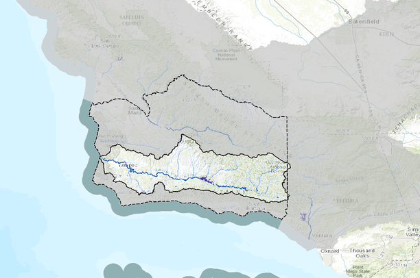 Map of the Santa Ynez Watershed showing water resources, water health, and water features and boundaries.